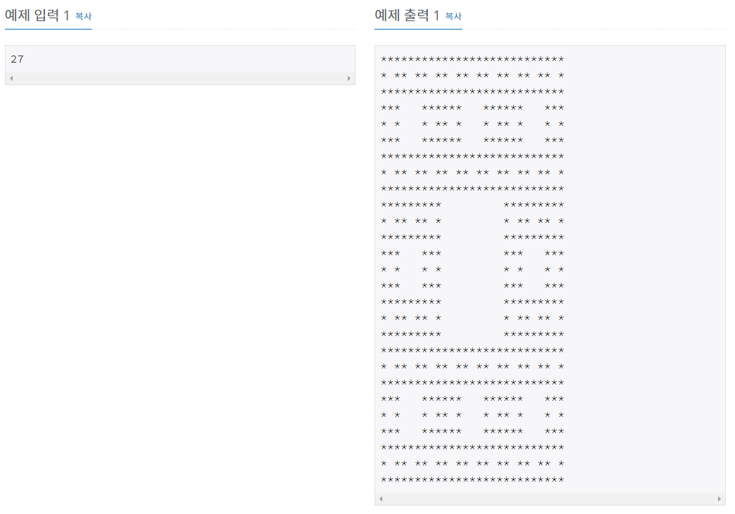 N이 3보다 클 경우, 크기 N의 패턴은 공백으로 채워진 가운데의 (N/3)×(N/3) 정사각형을 크기 N/3의 패턴으로 둘러싼 형태이다. 예를 들어 크기 27의 패턴은 예제 출력 1과 같다.