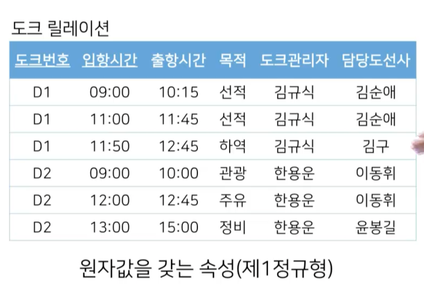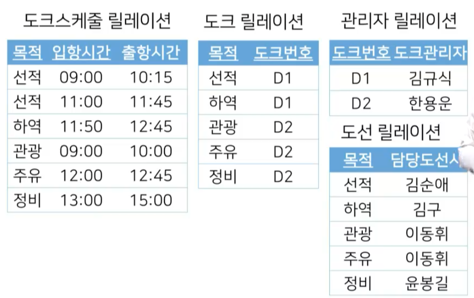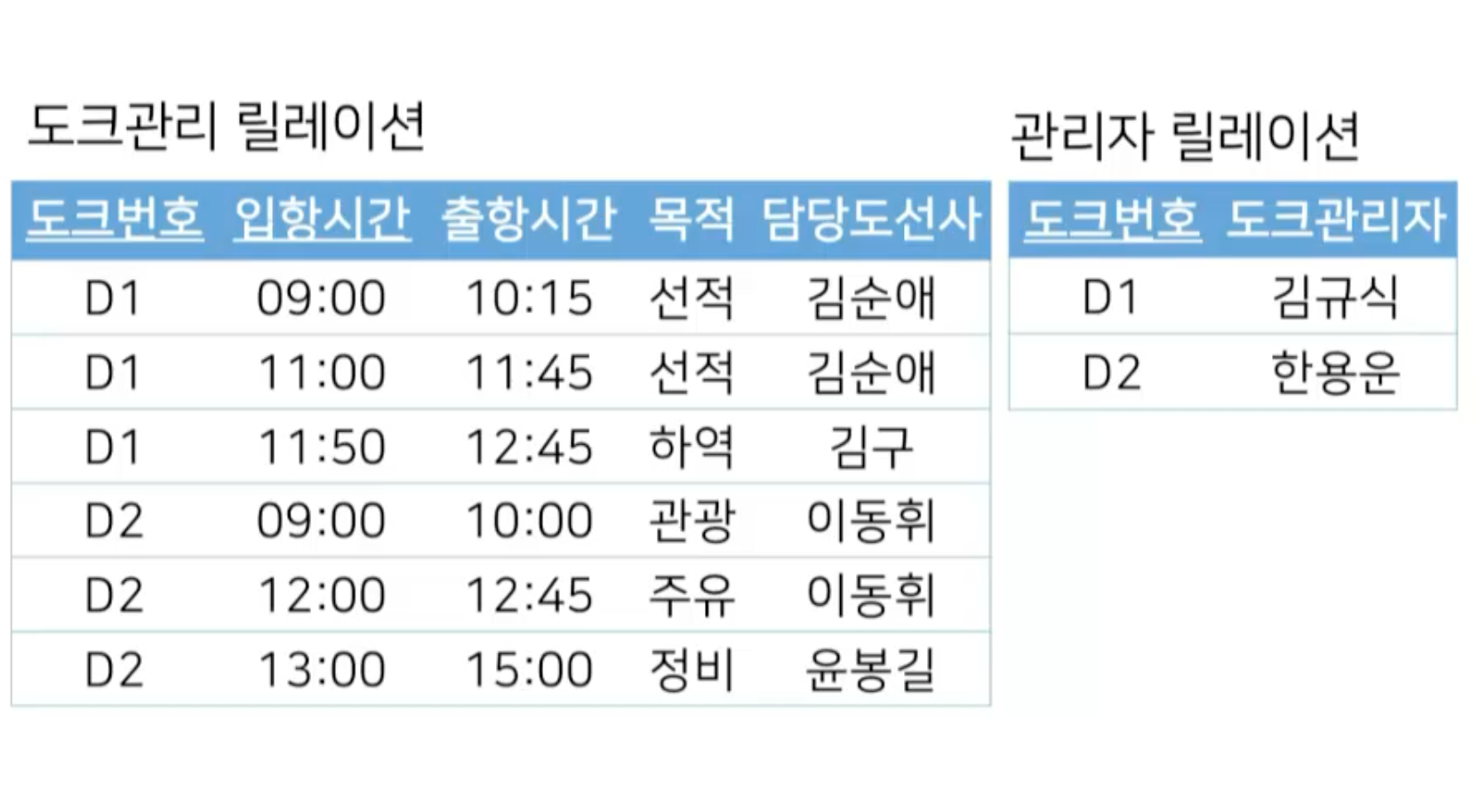 - 김규식이라고 하는 도크관리자가 입항시간이 언제고 출항시간이 언젠지 매칭할 수 없다