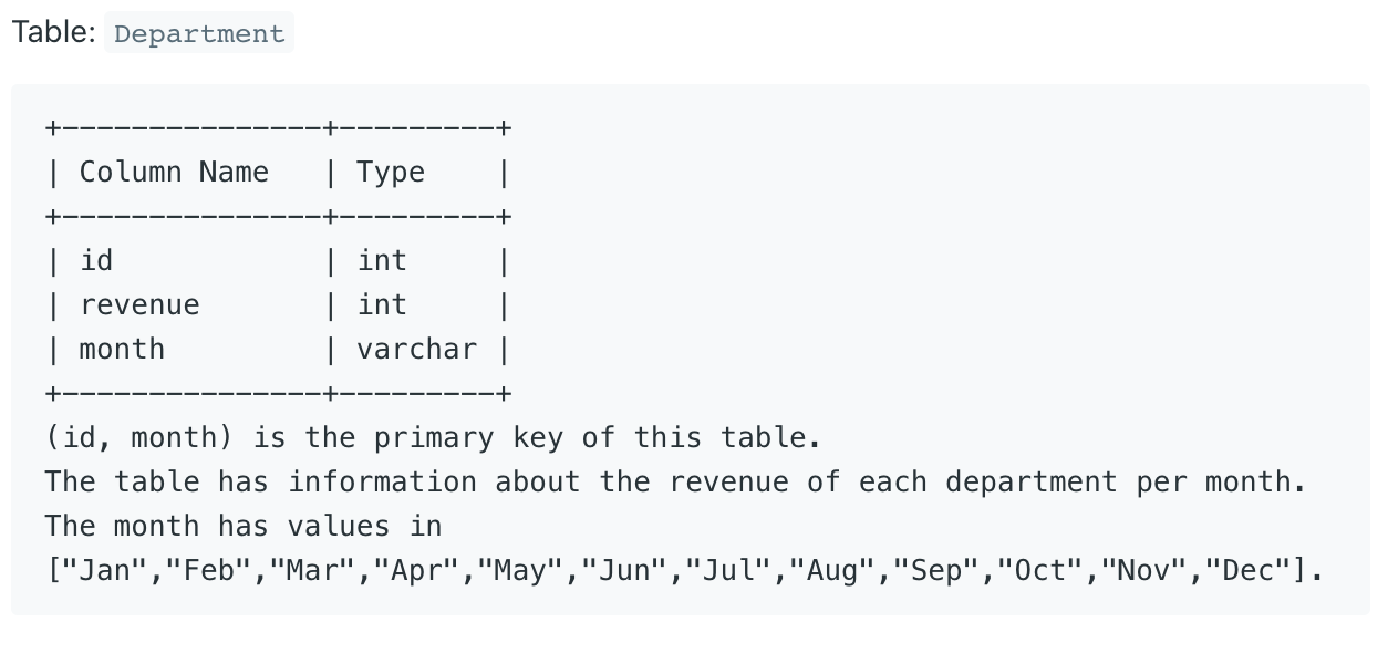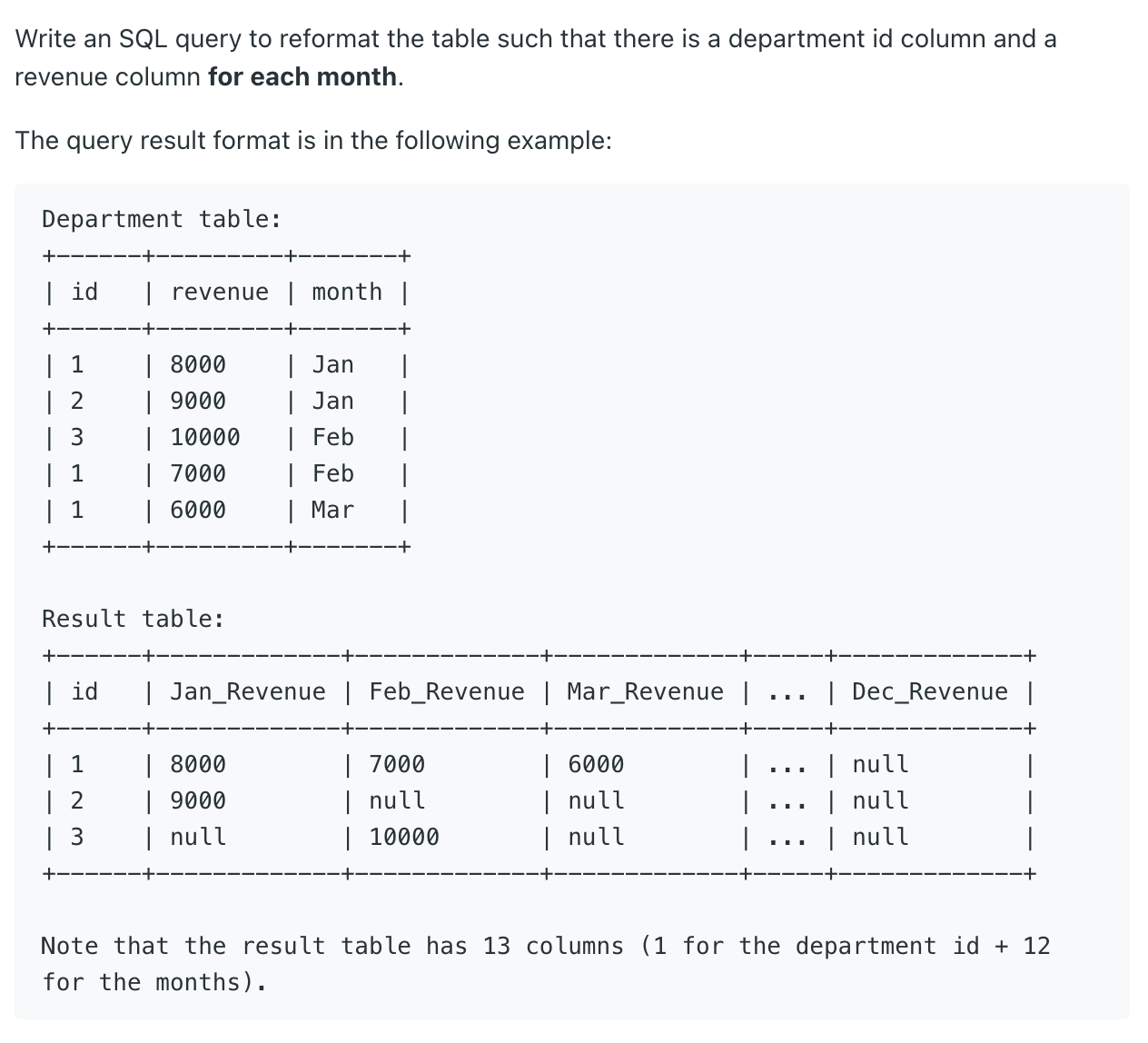 - 부서 ID 열과 각 달의 매출 열이 있도록 테이블을 다시 포맷하라