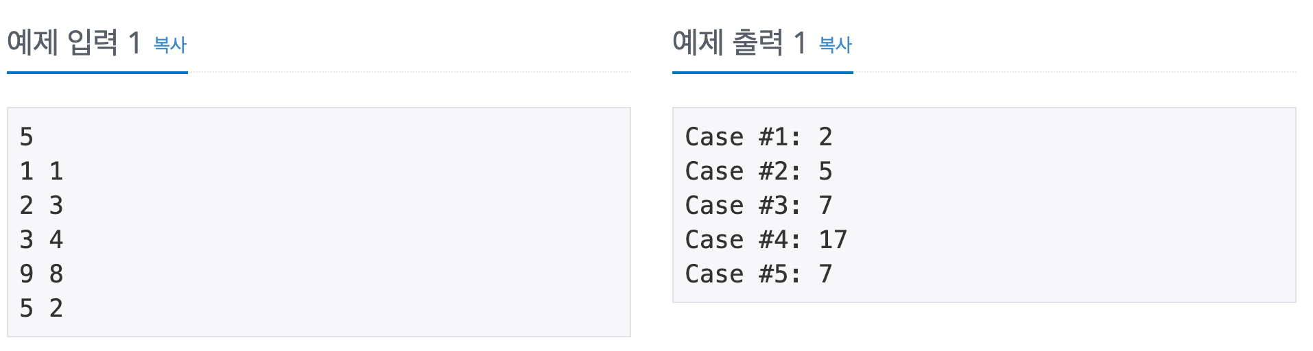 각 테스트 케이스마다 "Case #x: "를 출력한 다음, A+B를 출력한다. 테스트 케이스 번호는 1부터 시작한다.