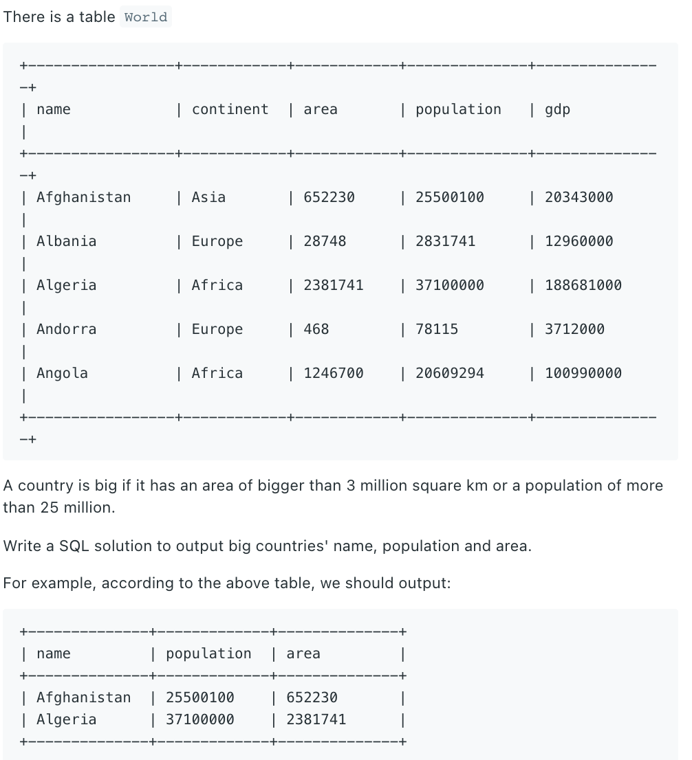 - 면적이 300만 km 초과이거나 인구가 2500백만 (25*100만) 초과인 나라 구하기