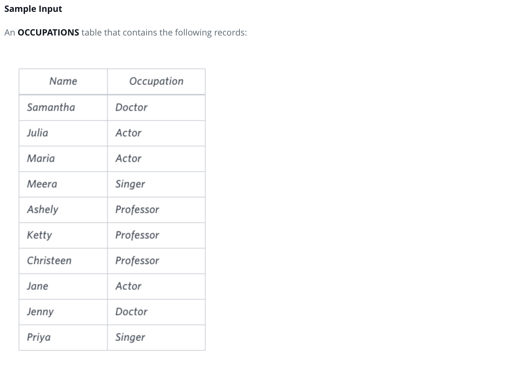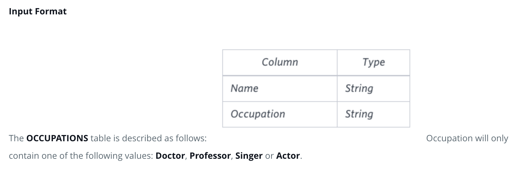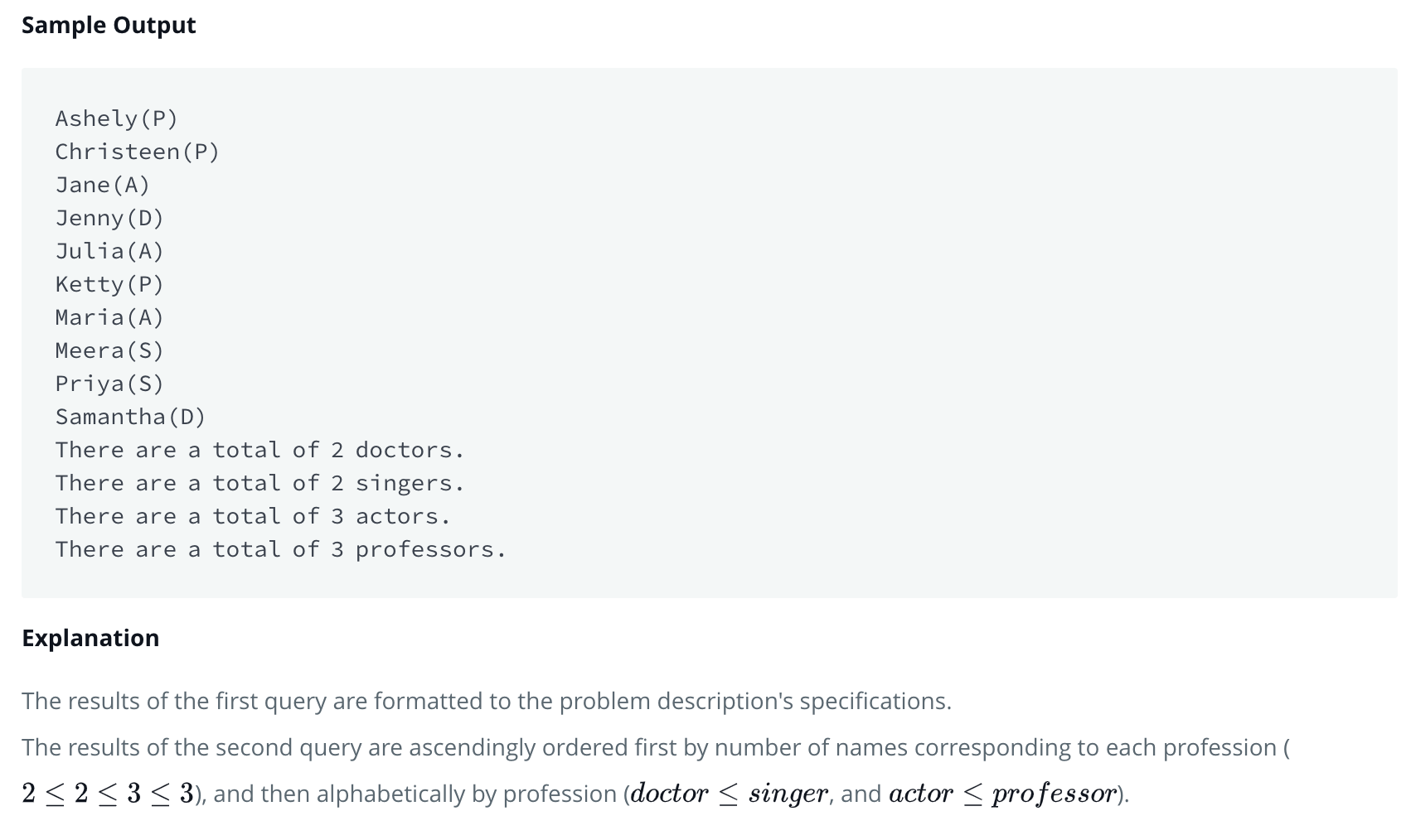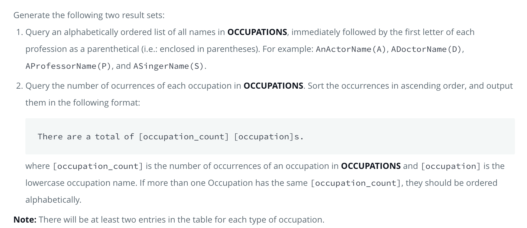 - occupation테이블의 모든 이름 목록을 알파벳 순서로 나열하고 각 직업의 첫 글자를 괄호 안에 묶어라