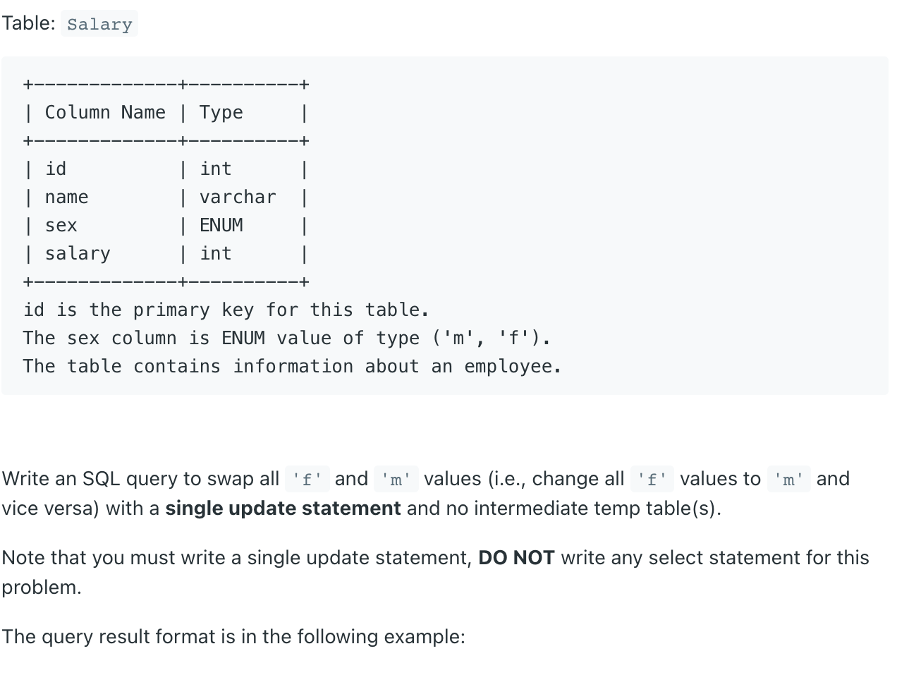 UPDATE Salary SET sex = CASE WHEN sex = 'm' THEN 'f'