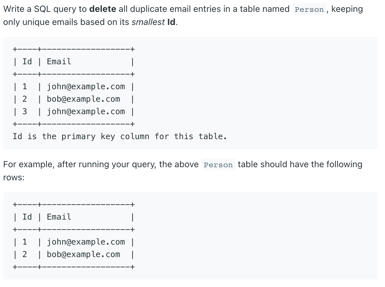 중복이 되는 이메일 삭제하되 ID가 작은 이메일 한개만 남기는 문제