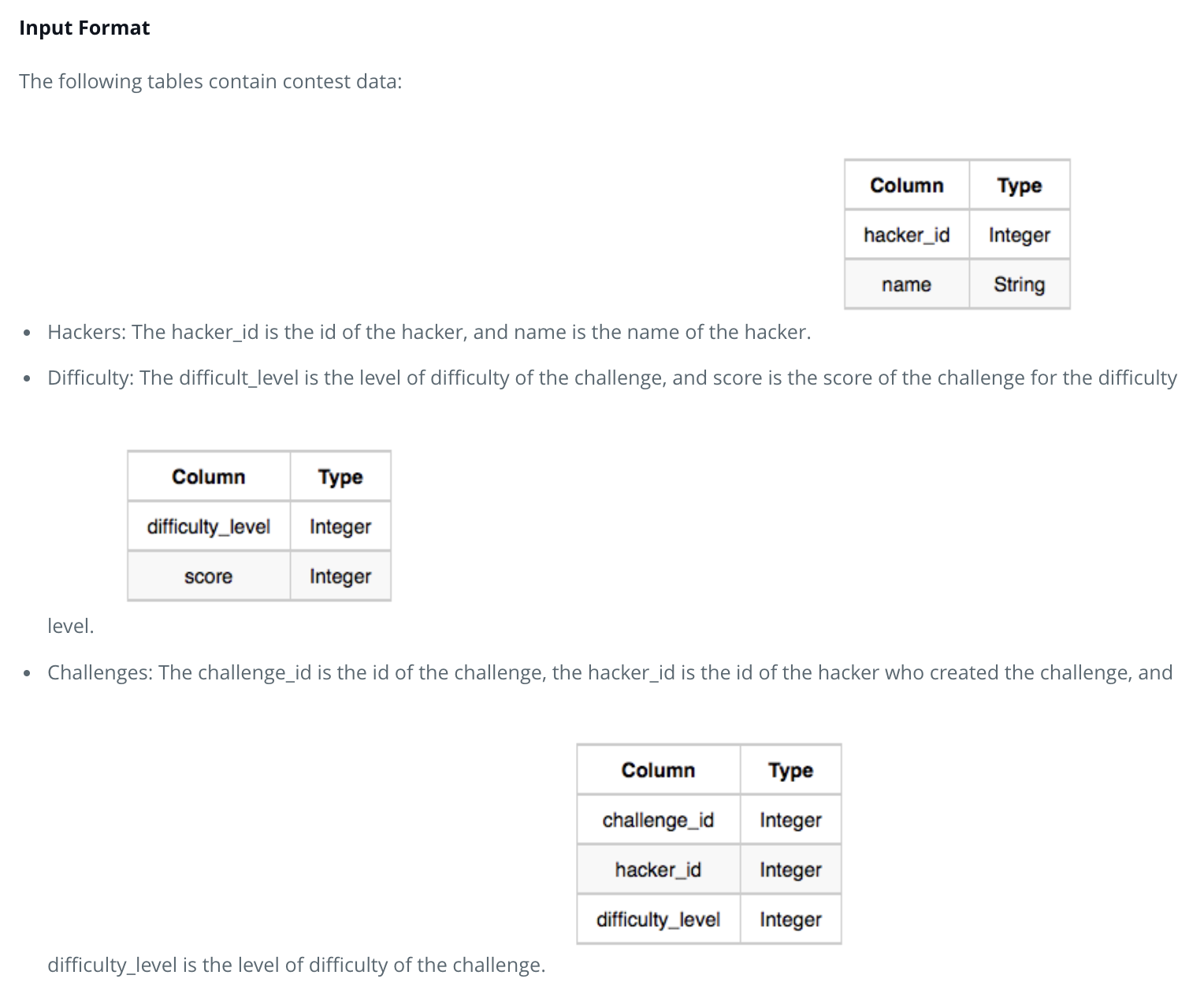 inner join hackers b on a.hacker_id = b.hacker_id3. submission 문제 아이디를 알아야 난이도를 알 수 있기 때문에 challenges 테이블과 조인
