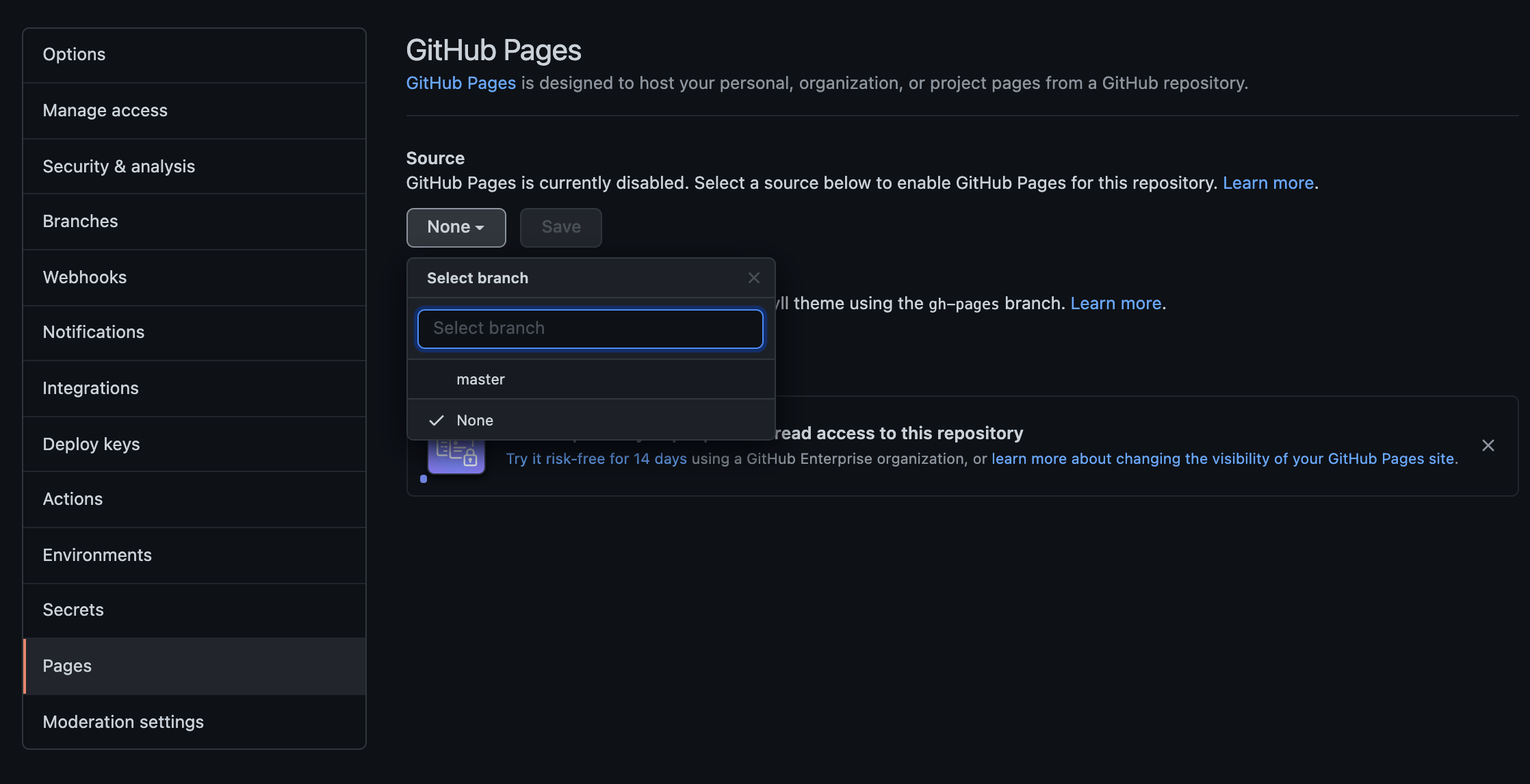 2. Pages > Branch master/main 선택
