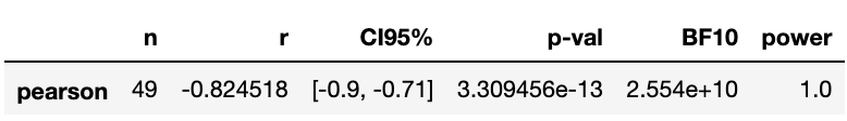 pg.corr(변수1, 변수2)