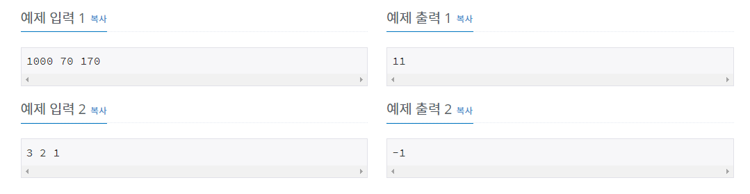 첫 번째 줄에 손익분기점 즉 최초로 이익이 발생하는 판매량을 출력한다. 손익분기점이 존재하지 않으면 -1을 출력한다.