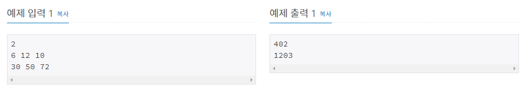 프로그램은 표준 입력에서 입력 데이터를 받는다. 프로그램의 입력은 T 개의 테스트 데이터로 이루어져 있는데 T 는 입력의 맨 첫 줄에 주어진다. 각 테스트 데이터는 한 행으로서 H, W, N, 세 정수를 포함하고 있으며 각각 호텔의 층 수, 각 층의 방 수, 몇 번째 손님인지를 나타낸다(1 ≤ H, W ≤ 99, 1 ≤ N ≤ H × W).