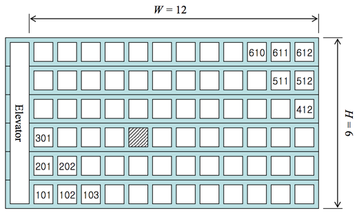 문제를 단순화하기 위해서 호텔은 직사각형 모양이라고 가정하자. 각 층에 W 개의 방이 있는 H 층 건물이라고 가정하자 (1 ≤ H, W ≤ 99). 그리고 엘리베이터는 가장 왼쪽에 있다고 가정하자(그림 1 참고). 이런 형태의 호텔을 H × W 형태 호텔이라고 부른다. 호텔 정문은 일층 엘리베이터 바로 앞에 있는데, 정문에서 엘리베이터까지의 거리는 무시한다. 또 모든 인접한 두 방 사이의 거리는 같은 거리(거리 1)라고 가정하고 호텔의 정면 쪽에만 방이 있다고 가정한다.