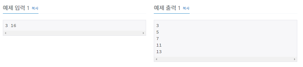 첫째 줄에 자연수 M과 N이 빈 칸을 사이에 두고 주어진다. (1 ≤ M ≤ N ≤ 1,000,000) M이상 N이하의 소수가 하나 이상 있는 입력만 주어진다.