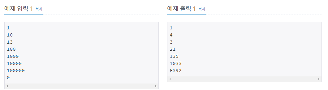 입력은 여러 개의 테스트 케이스로 이루어져 있다. 각 케이스는 n을 포함하는 한 줄로 이루어져 있다.